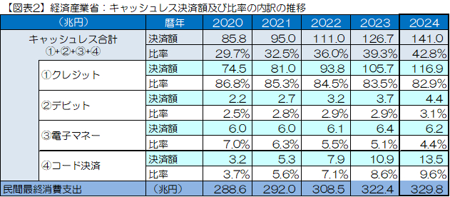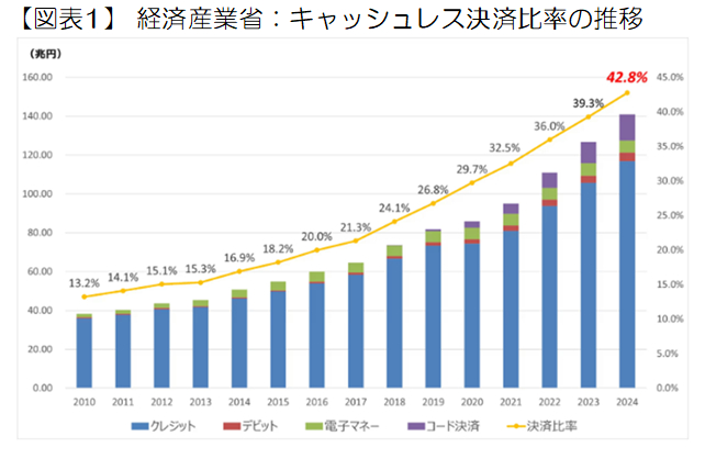 2025年3月に公表された2024年の日本国内のキャッシュレス決済比率【図表1】は、42.8%(2023年比+3.5%)となり、決済額も141兆円を超える水準まで拡大しています。直近3年間で決済比率は10ポイント、決済額は46兆円増加しています。