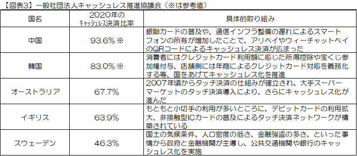 海外の主要国のキャッシュレス決済比率は、それぞれ異なる事情はあるものの、5年前の時点で50%から90%を超える水準に達しており【図表3】、日本の40%台では依然として大きく劣後している水準と言えます。