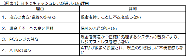 日本の場合、安全な生活環境、通貨としての「円」の信頼の高さ、POSレジやATMの充実といった恵まれた環境が、キャッシュレスがもう一段進まない要因としてあげられています【図表4】。社会の治安が良いため、所持している現金の盗難や偽札が流通することも少ないので、キャッシュレスにする必要性を感じない理由とされています。