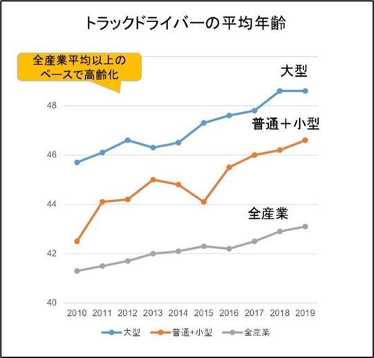 グラフは、トラックドライバーの平均年齢を示したものであり、全産業と比べて5歳程度高く、平均以上のペースで高齢化が進んでいます。